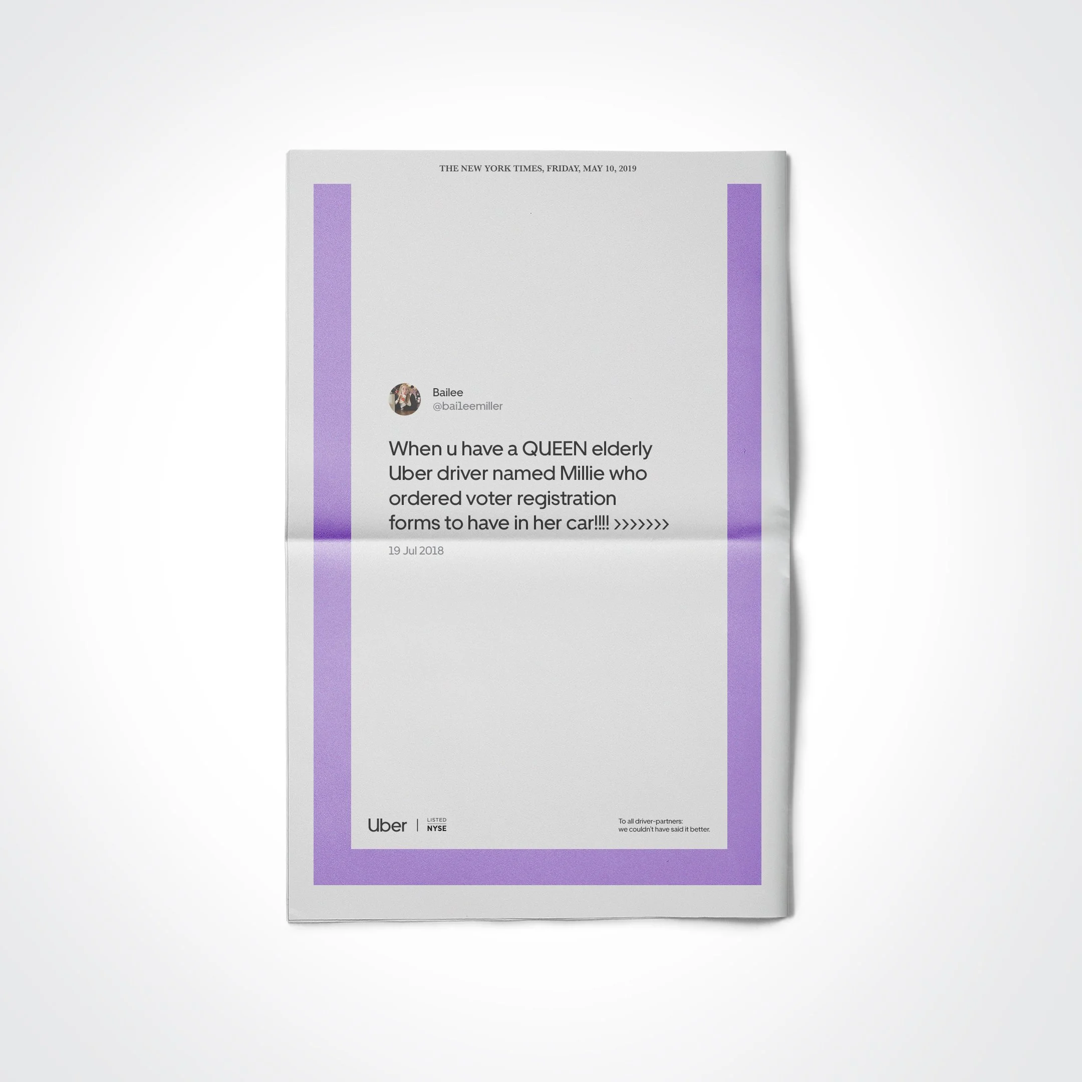 Uber’s IPO was one of the most anticipated in history. It was an opportunity for the company to take the backseat, and dedicate this moment to the people who made it possible: drivers, riders, couriers, restauranteurs and freighters. We set out across 24,000 miles with stories of people who changed the way the world moves. We then scoured the internet to find all the ways that make taking an Uber special, and the drivers who make a difference. We turned these small moments of gratitude into billboards around the globe, and shined a spotlight across our social feeds.